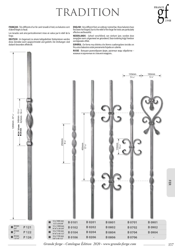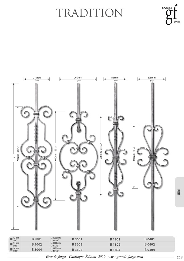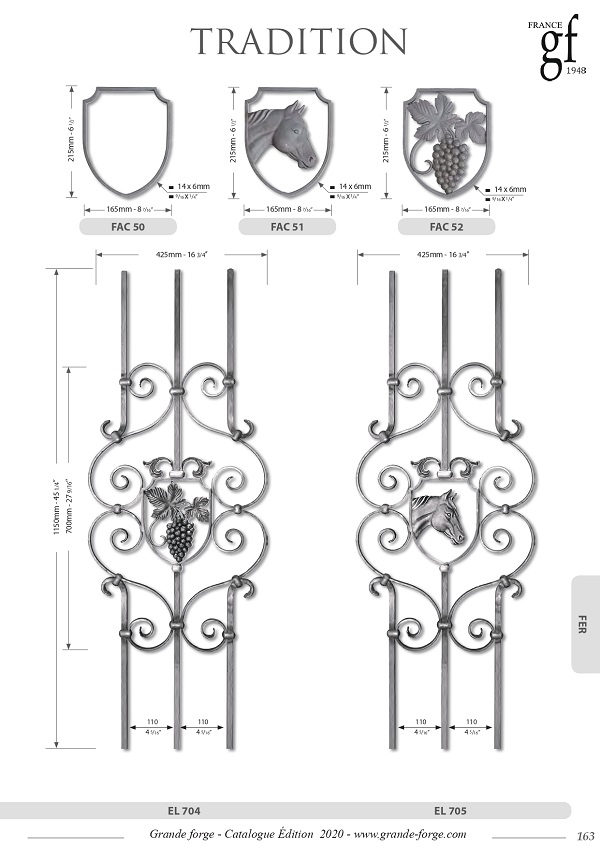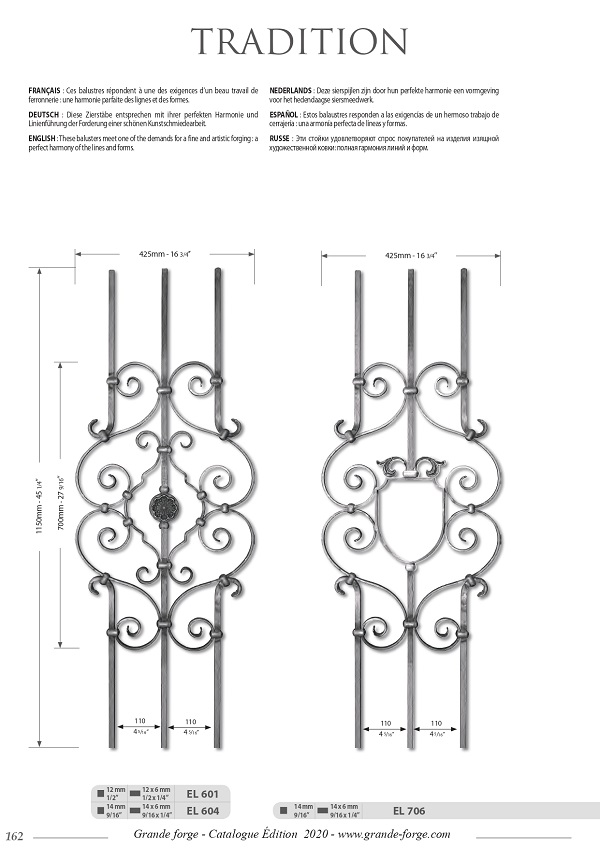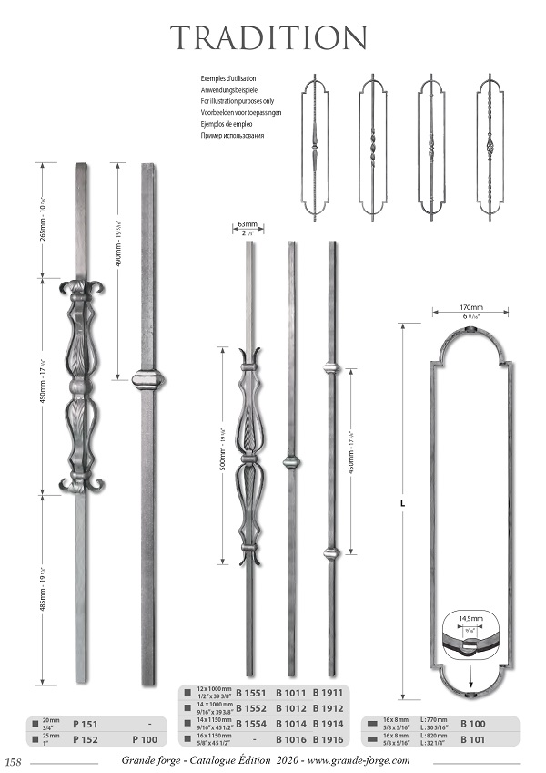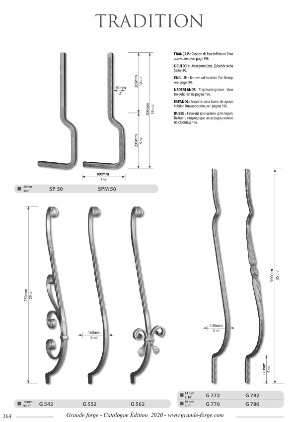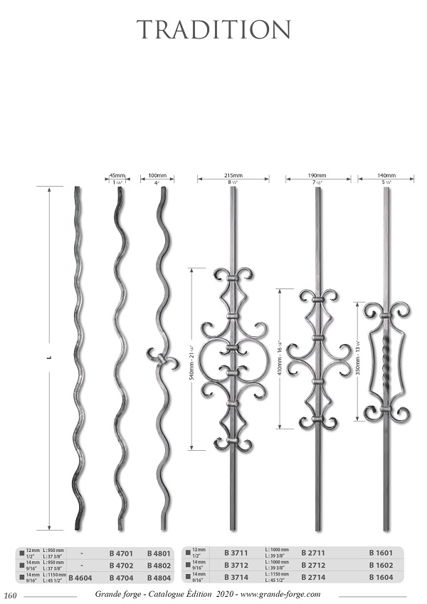 Колекція Tradition це - велике різноманіття форм та обробки металу, ковані, кручені, штамповані з орнаментом та без. Комплектуючі поставляються у нефарбованому вигляді.